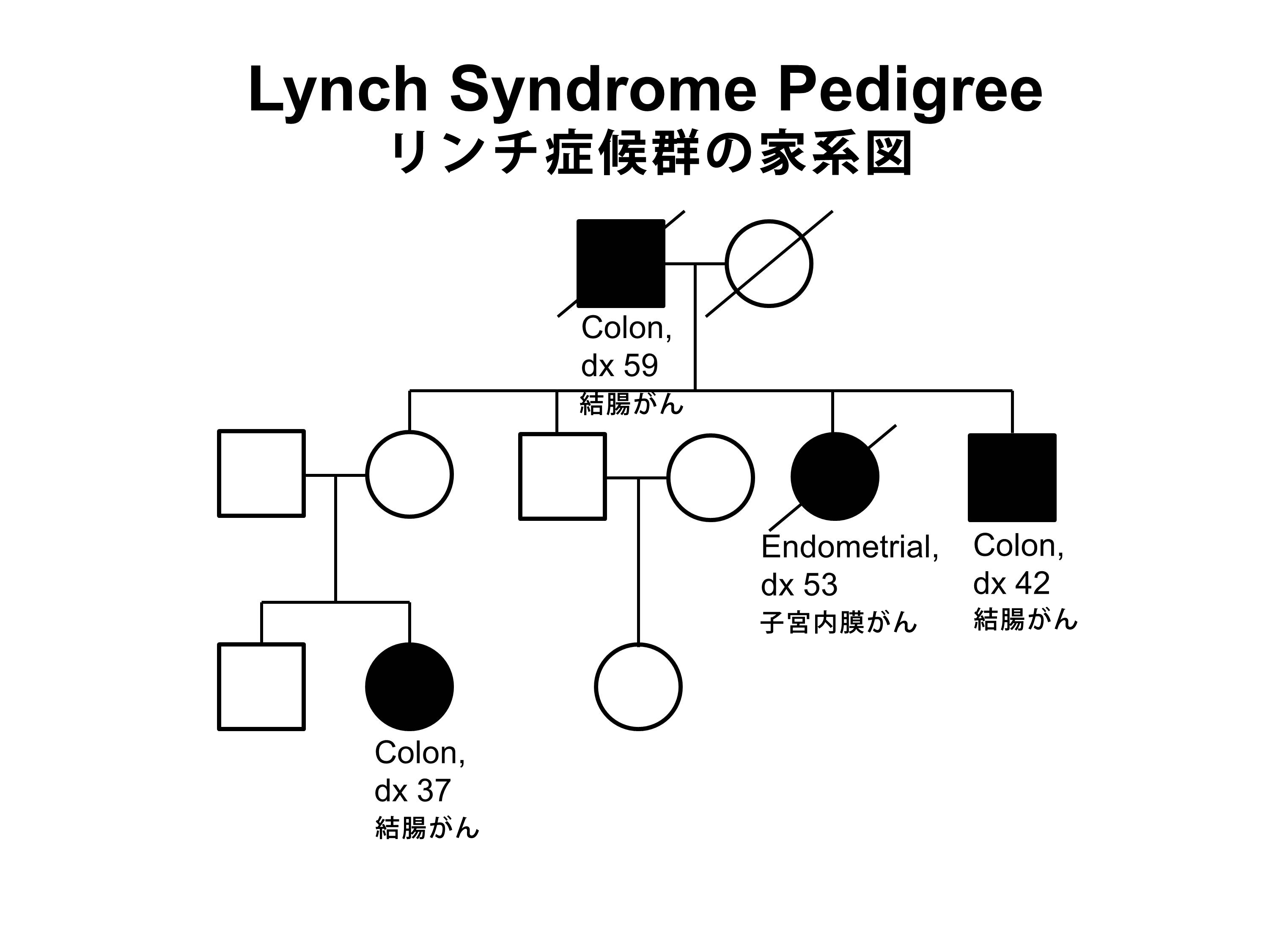図3.リンチ症候群家系図。この家系図は、結腸がんまたは子宮内膜がんを(一部の個人では若い年齢で)発症した罹患家系員や不完全浸透など、リンチ症候群を有する家系の古典的な特徴の一部を示す。リンチ症候群家系は、これらの特徴の一部またはすべてを示す可能性がある。リンチ症候群家系には、このほか消化管がん、婦人科がん、泌尿生殖器がん、または他の結腸外のがんの個人が存在する場合もある。図に示しているように母系または父系を通して、常染色体優性症候群としてリンチ症候群が伝播する可能性がある。がんのリスクは100%ではないため、例えばこの家系の37歳で結腸がんと診断された女性の母親のように、リンチ症候群の個人ががんに罹患しない場合もある(不完全浸透と呼ばれる)。 BRCA1またはBRCA2病原性多様体キャリアに発生する乳がんおよび卵巣がんと非キャリアに発生する乳がんおよび卵巣がんとを区別する疾病特徴的な特性はない。BRCA1病原性多様体キャリアに発生する乳がんは、ER陰性、プロゲステロン受容体陰性、HER2/neu受容体陰性(すなわち、トリプルネガティブ乳がん[TNBC])であり、基底細胞表現型(basal phenotype)を有する傾向がより高い。BRCA1関連卵巣がんは、高悪性度で病理組織学的に漿液性である可能性が高い。(詳しい情報については、本要約の乳がんの病理学および卵巣がんの病理学のセクションを参照のこと。)